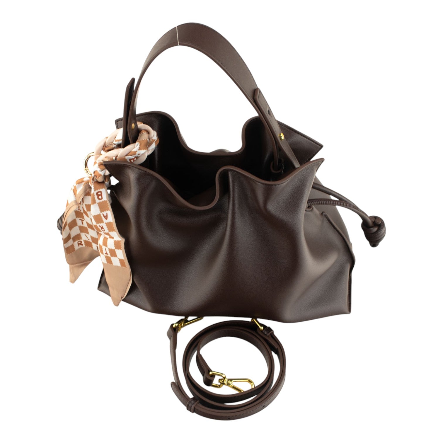 Su tamaño medio es ideal para el día a día, permitiéndote llevar lo esencial de forma organizada y cómoda. Tiene asa de mano regulable y cinta adicional que te permitirá llevarlo en opción de bandolera, el cierre es mediante frunce que puedes adaptar y cambiará su forma ligeramente y cierre imantado. Charm de la imagen incluido