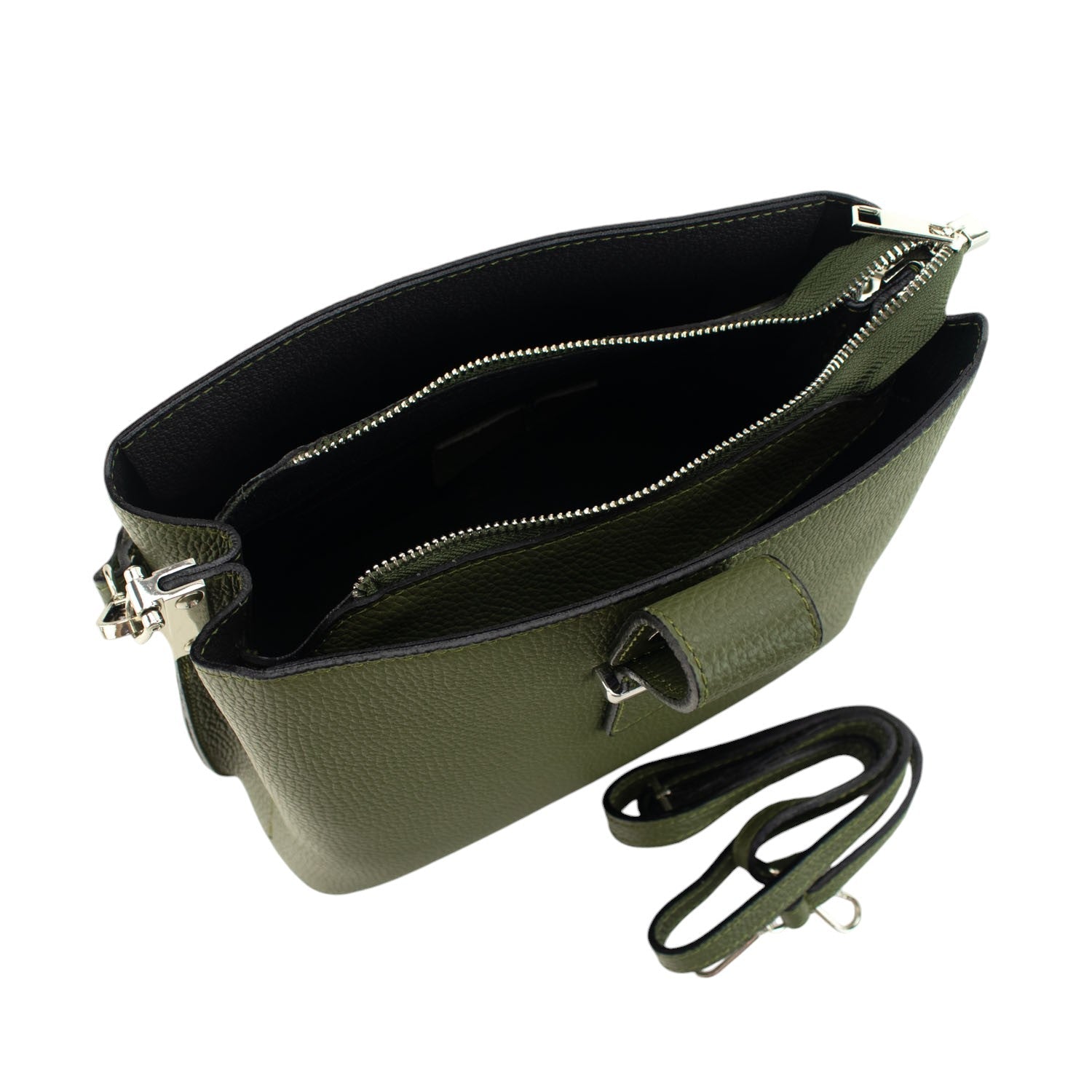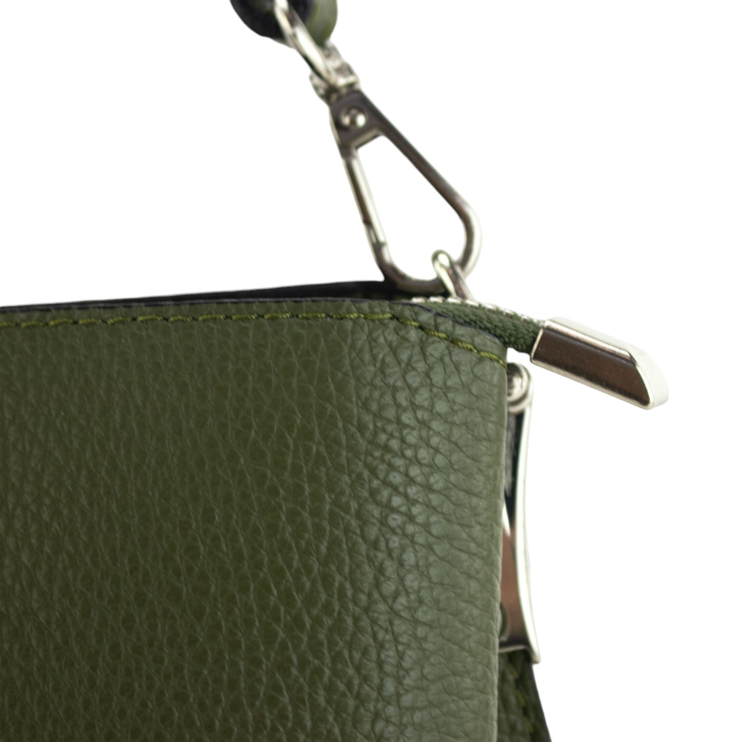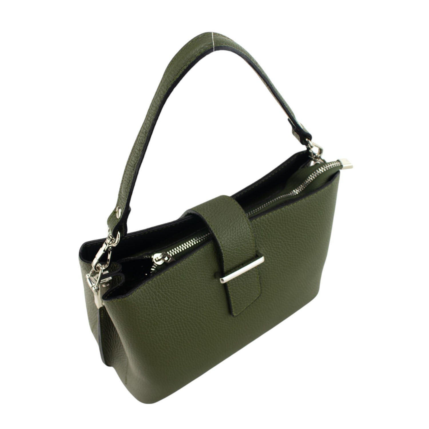 Un bolso muy original para lucir a diario, realizado en Piel 100% genuina vacuno italiana, este bolso está hecho en Italia con una excelente manufactura y calidad, tiene un cierre de broche muy original, con doble compartimento interior amplio con cierre de cremallera. Dispone de asa mano y cinta de bandolera.