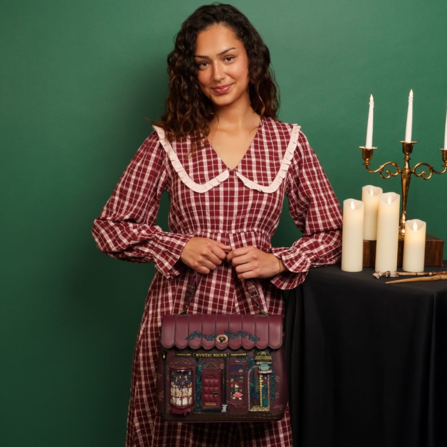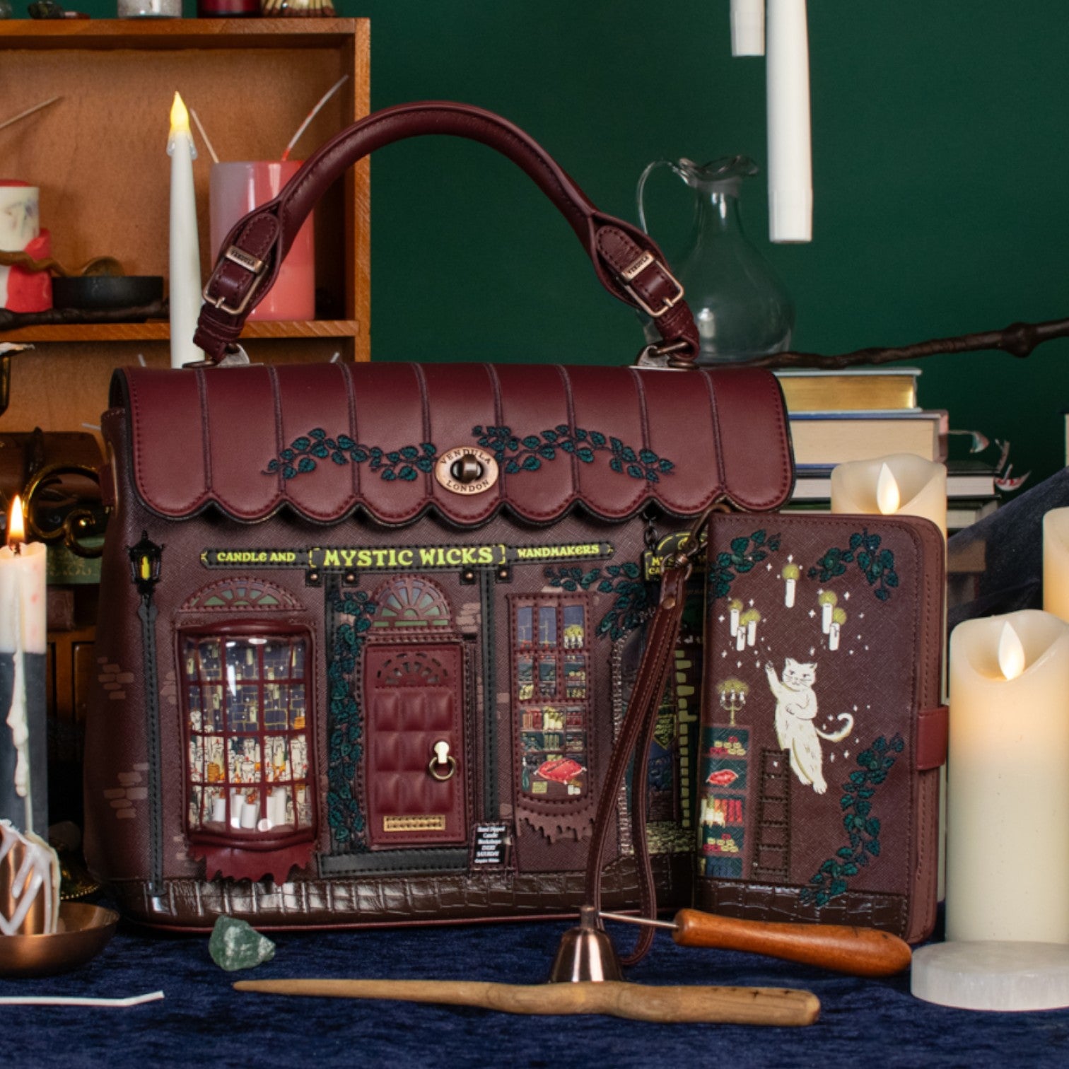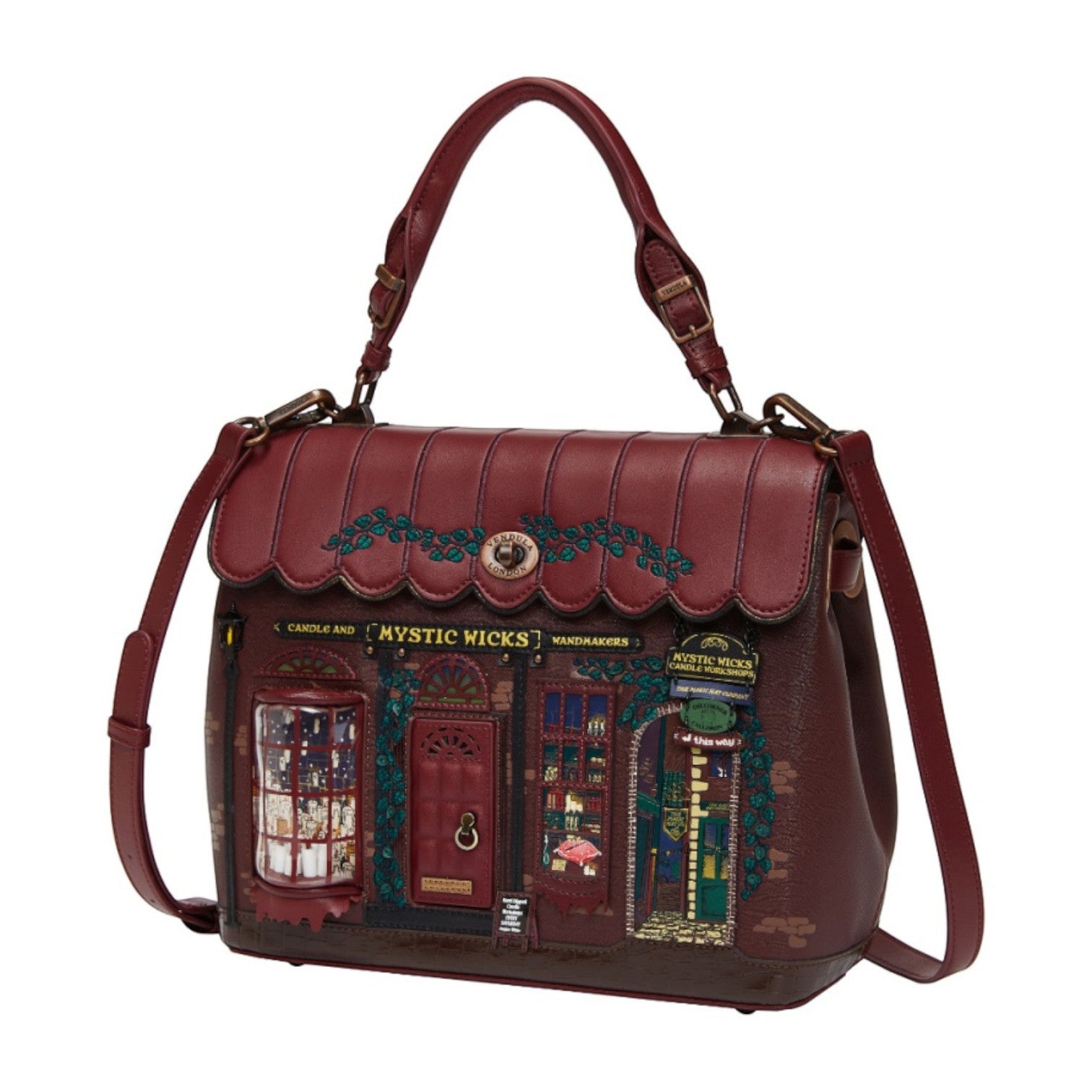 Un bolso que te enamorará nada más tenerlo, está repleto de detalles combinando tonos burdeos inspirado en las tiendas de velas, mechas místicas y varitas, viene con detalles en relieve y bordados que lo hacen único , tiene apertura con cierre de solapa con broche y cremallera, además de cinta regulable.