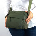 Ligera Bandolera compacta con diferentes compartimentos con cierre de cremallera, en acabado estilo panel de abeja, material muy ligero y agradable al tacto, cinta regulable a la altura deseada, diseño actual.