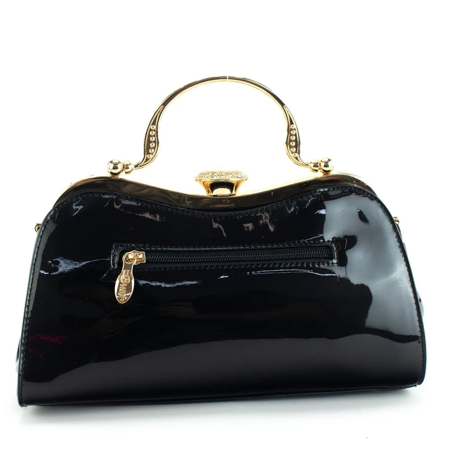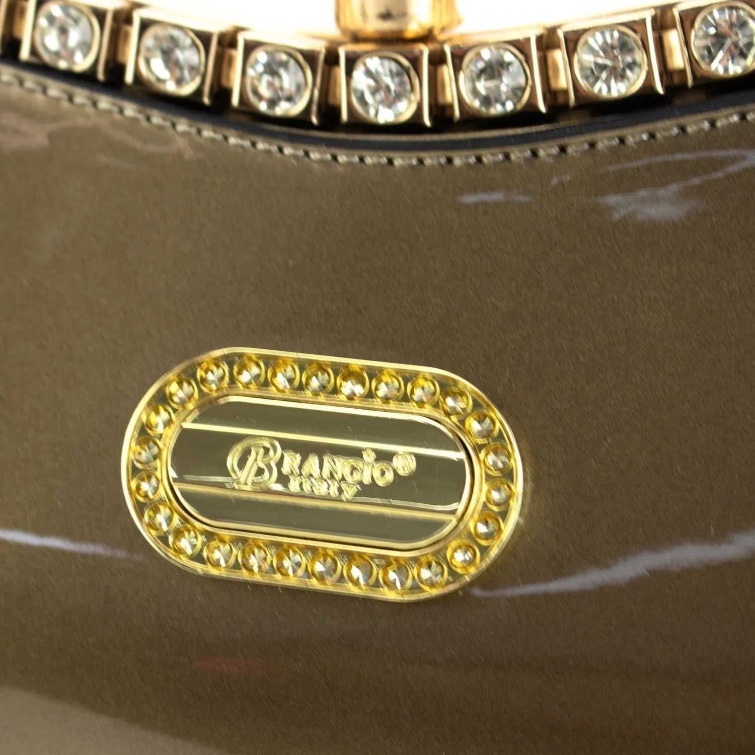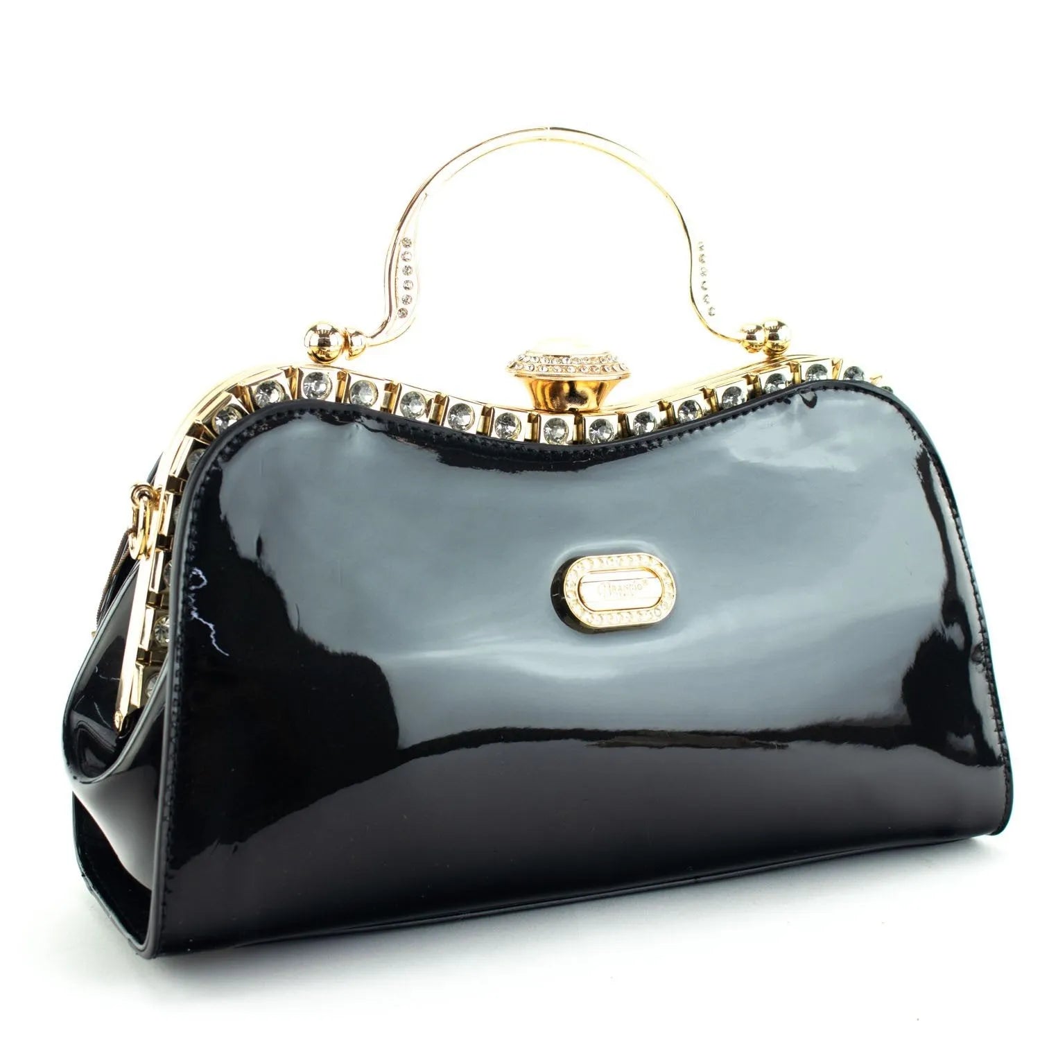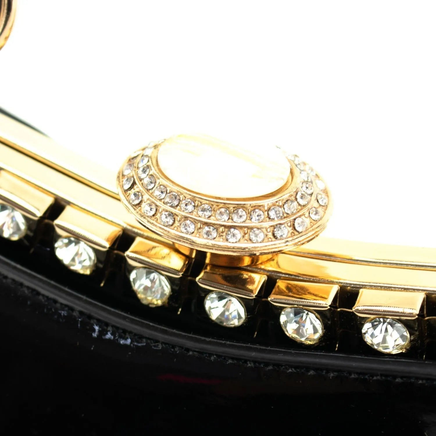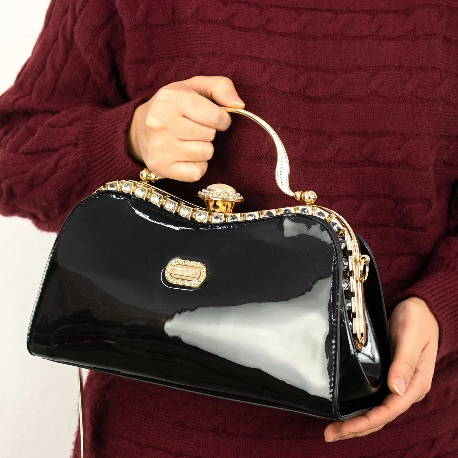 Un bolso super original estilo clutch que te enamorará anda más tenerlo en tus manos. Un bolso espectacular con asa de mano y cinta de bandolera en cadena metalizada. Con un compartimento interior amplio con cierre de broche espectacular. Acabado con tonos lisos en charol brillante y decorado con brillantes y apliques ¡Te encantará!