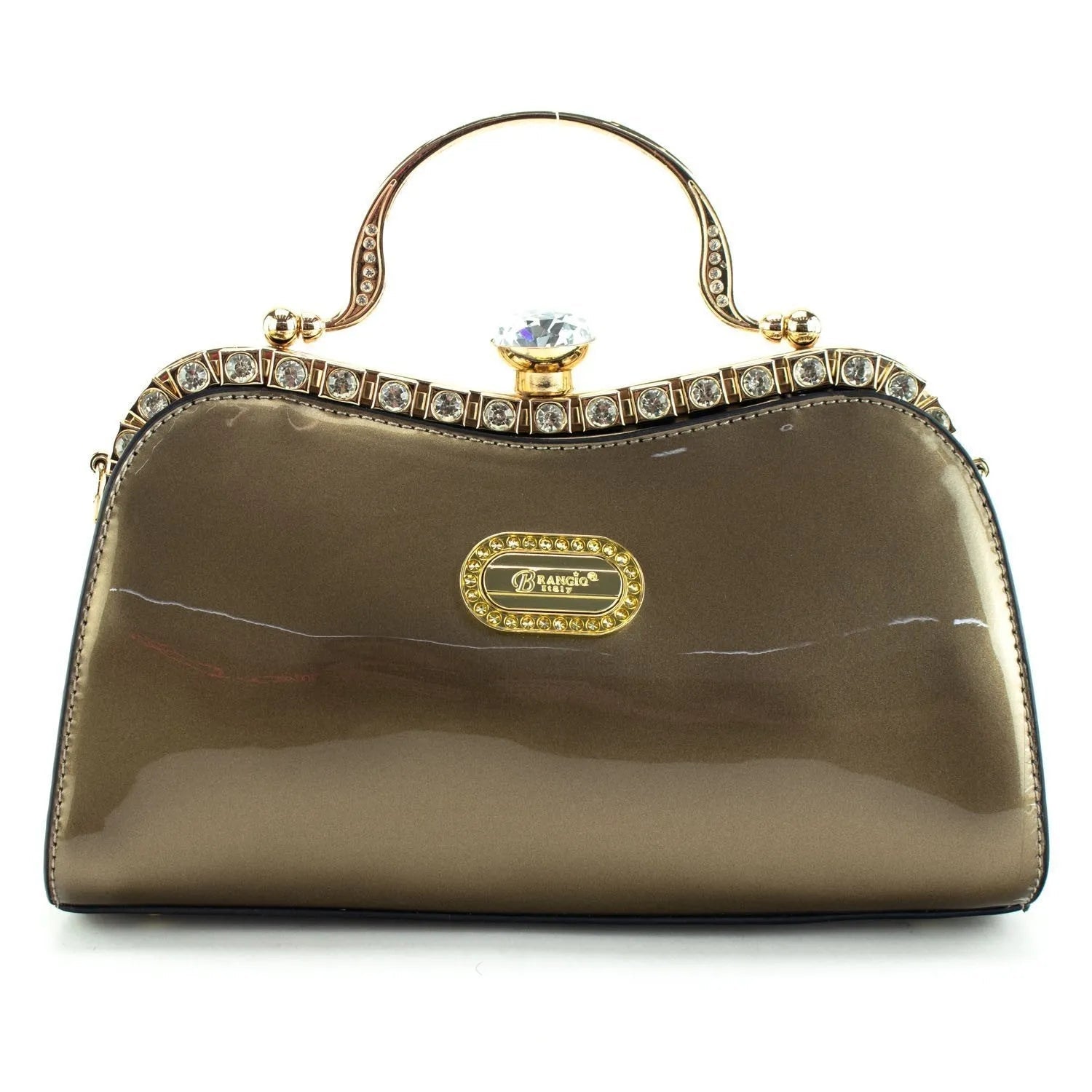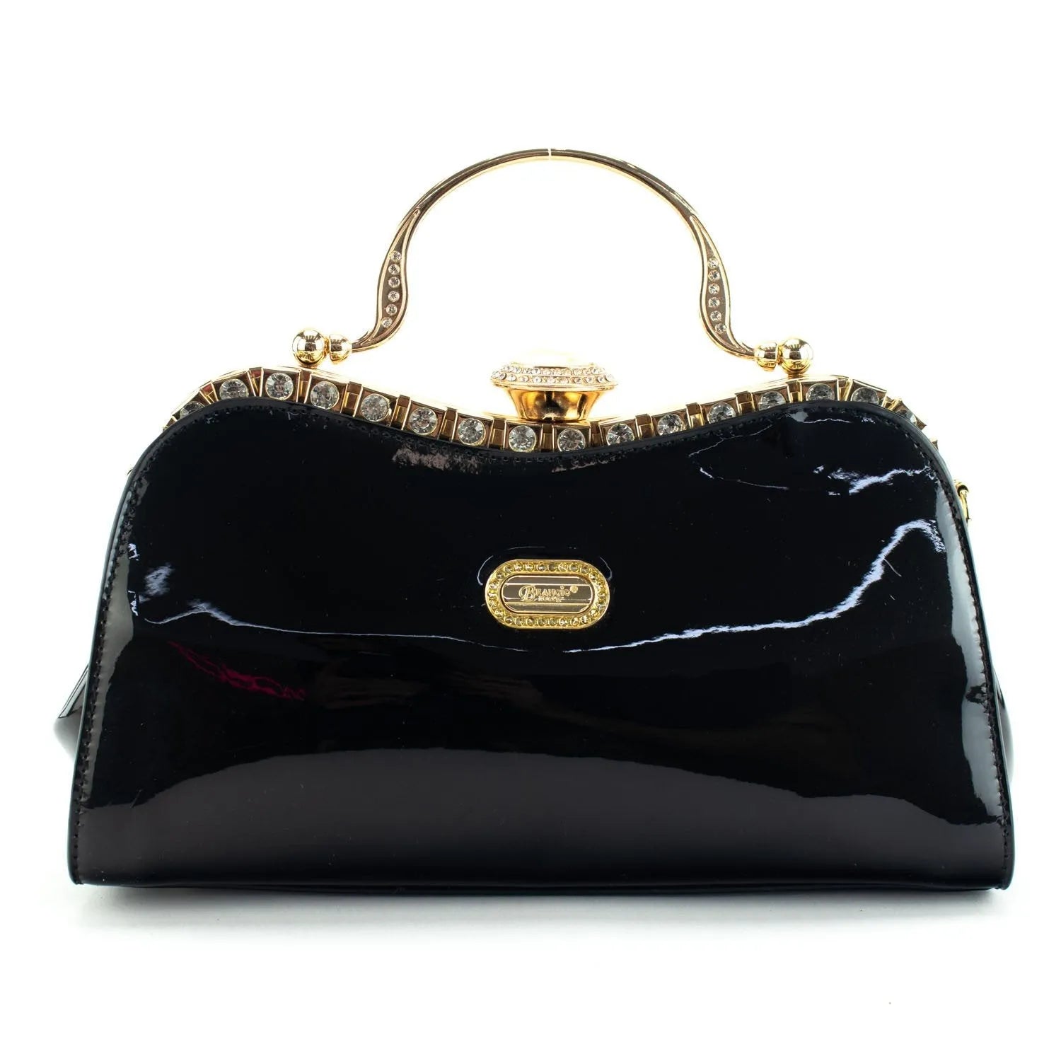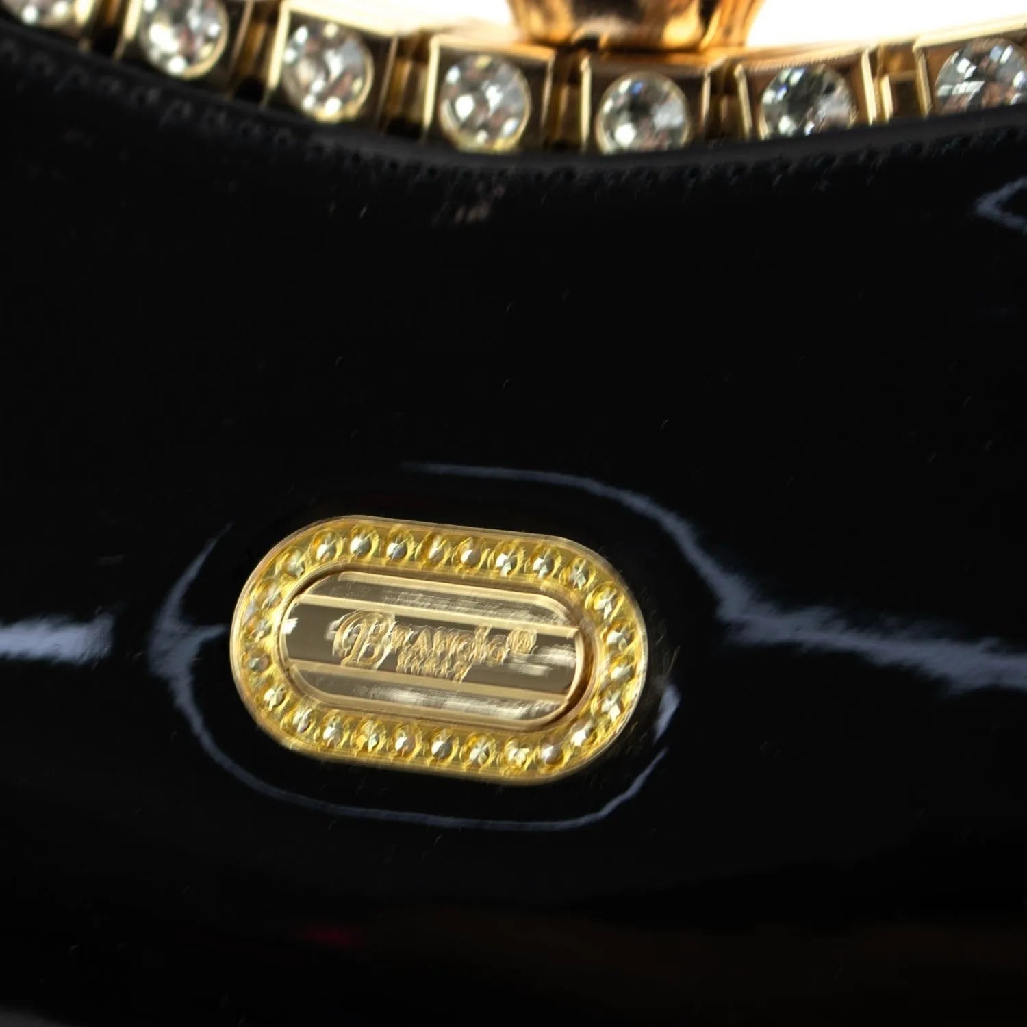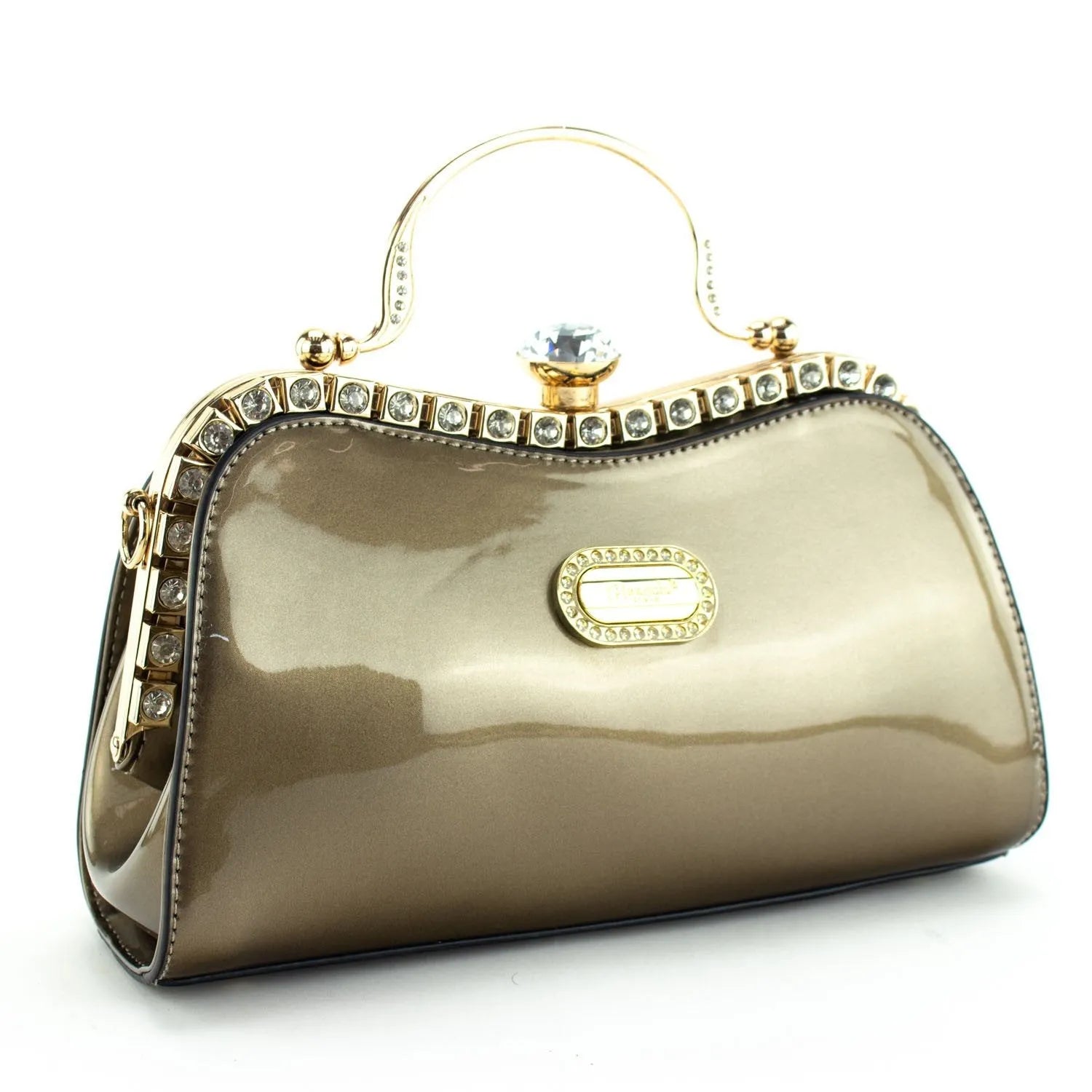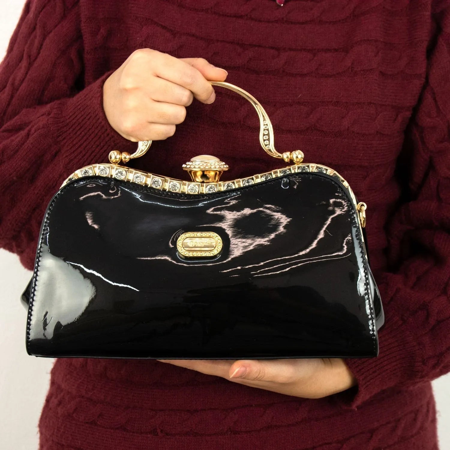 Un bolso super original estilo clutch que te enamorará anda más tenerlo en tus manos. Un bolso espectacular con asa de mano y cinta de bandolera en cadena metalizada. Con un compartimento interior amplio con cierre de broche espectacular. Acabado con tonos lisos en charol brillante y decorado con brillantes y apliques ¡Te encantará!