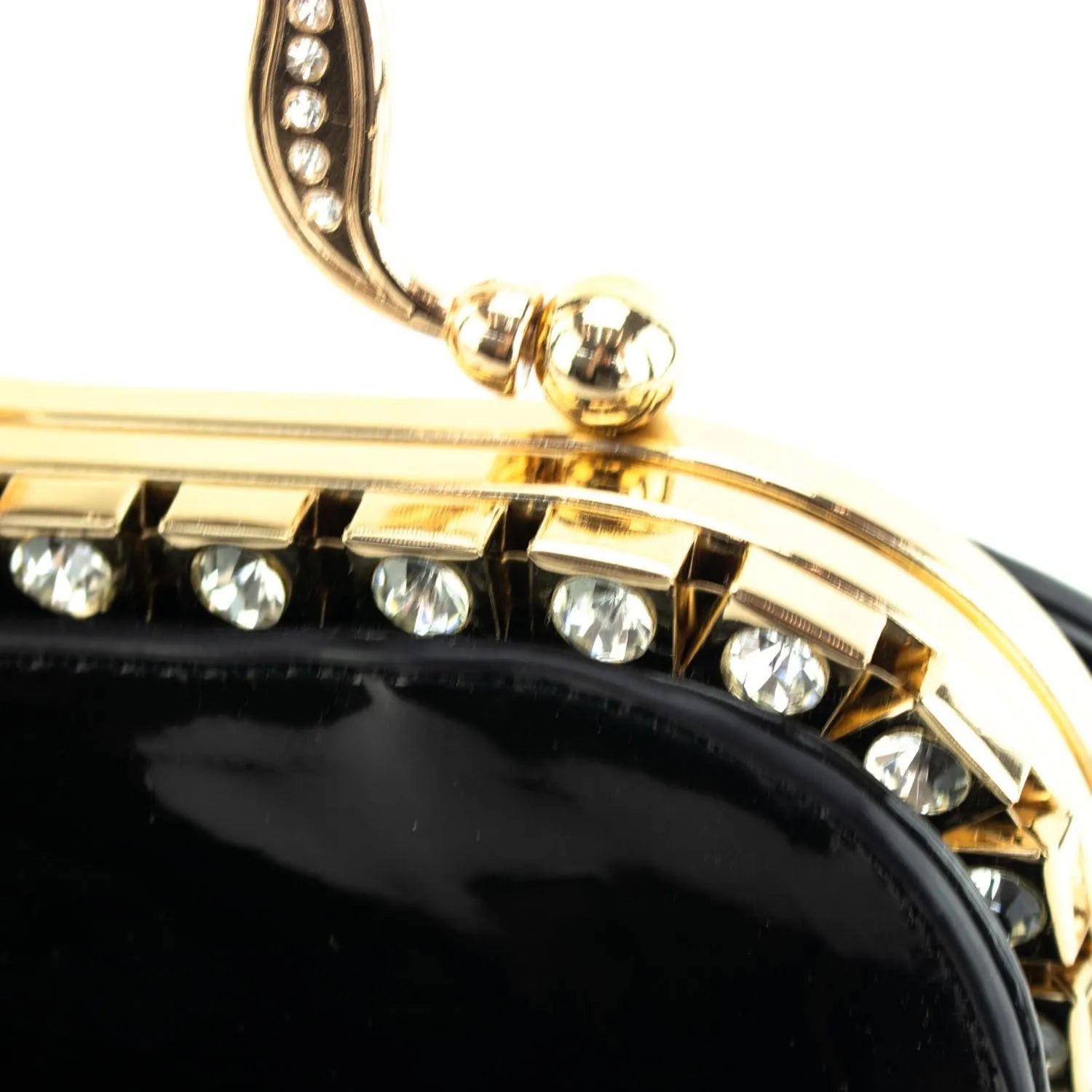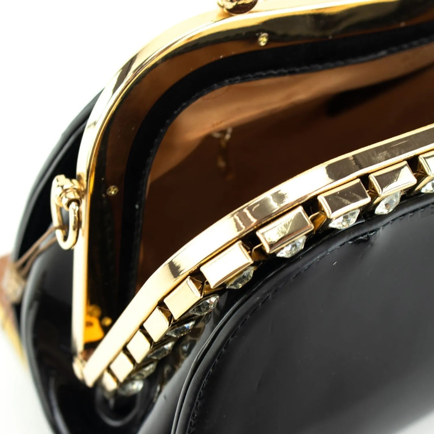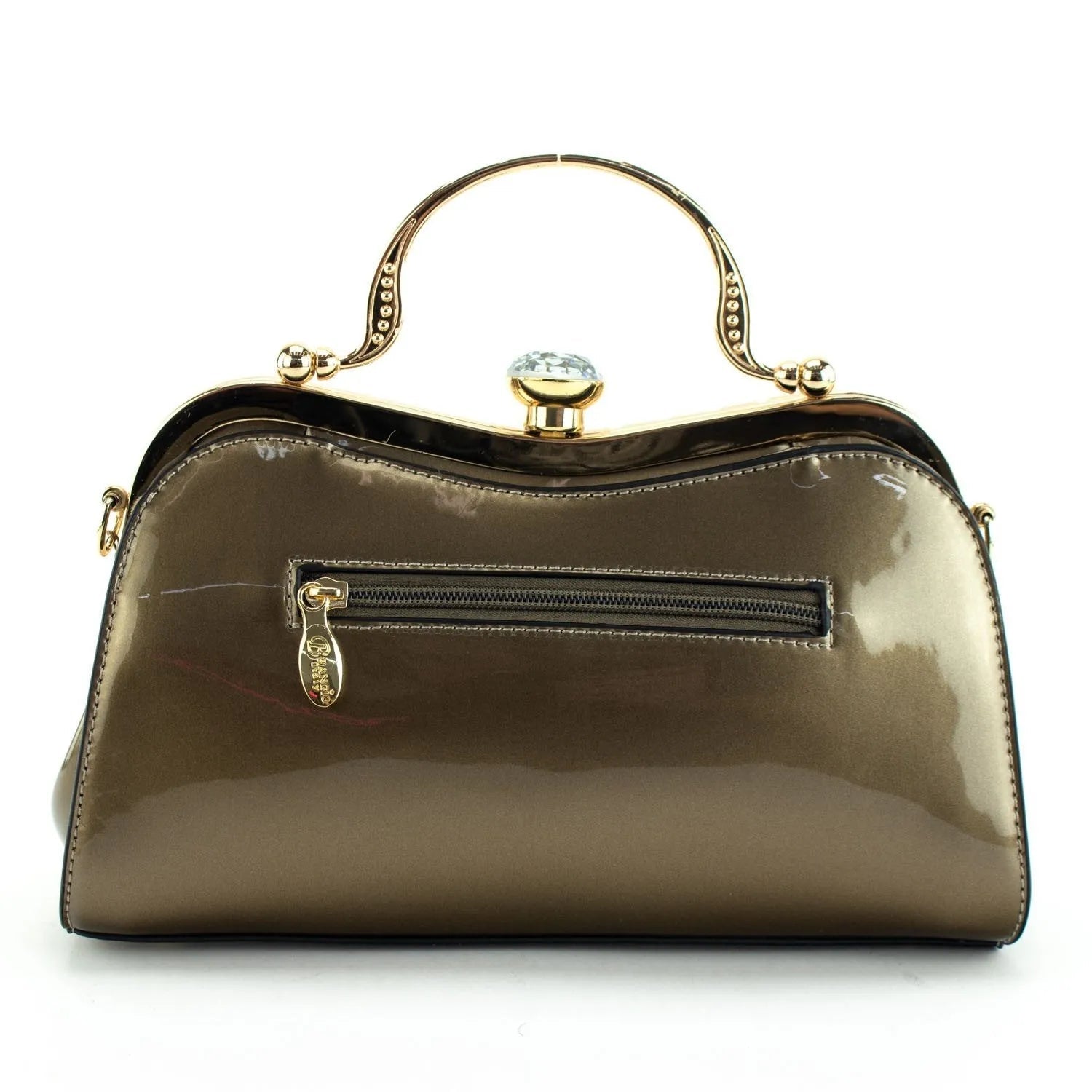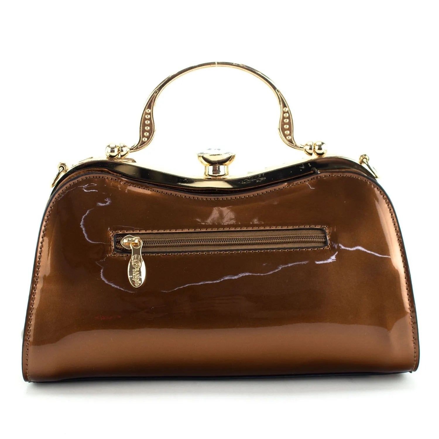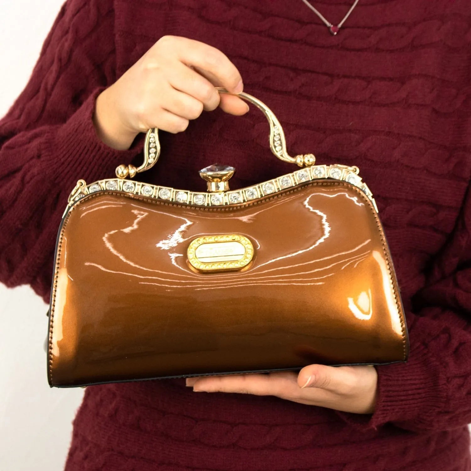 Un bolso super original estilo clutch que te enamorará anda más tenerlo en tus manos. Un bolso espectacular con asa de mano y cinta de bandolera en cadena metalizada. Con un compartimento interior amplio con cierre de broche espectacular. Acabado con tonos lisos en charol brillante y decorado con brillantes y apliques ¡Te encantará!