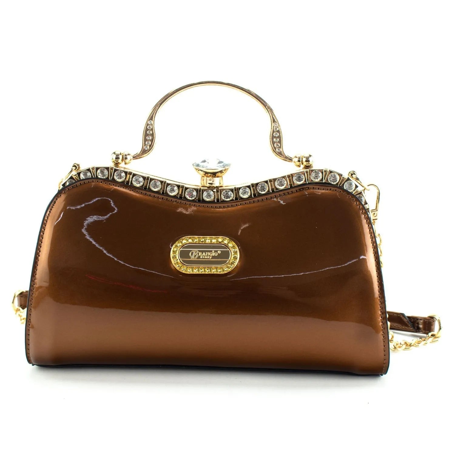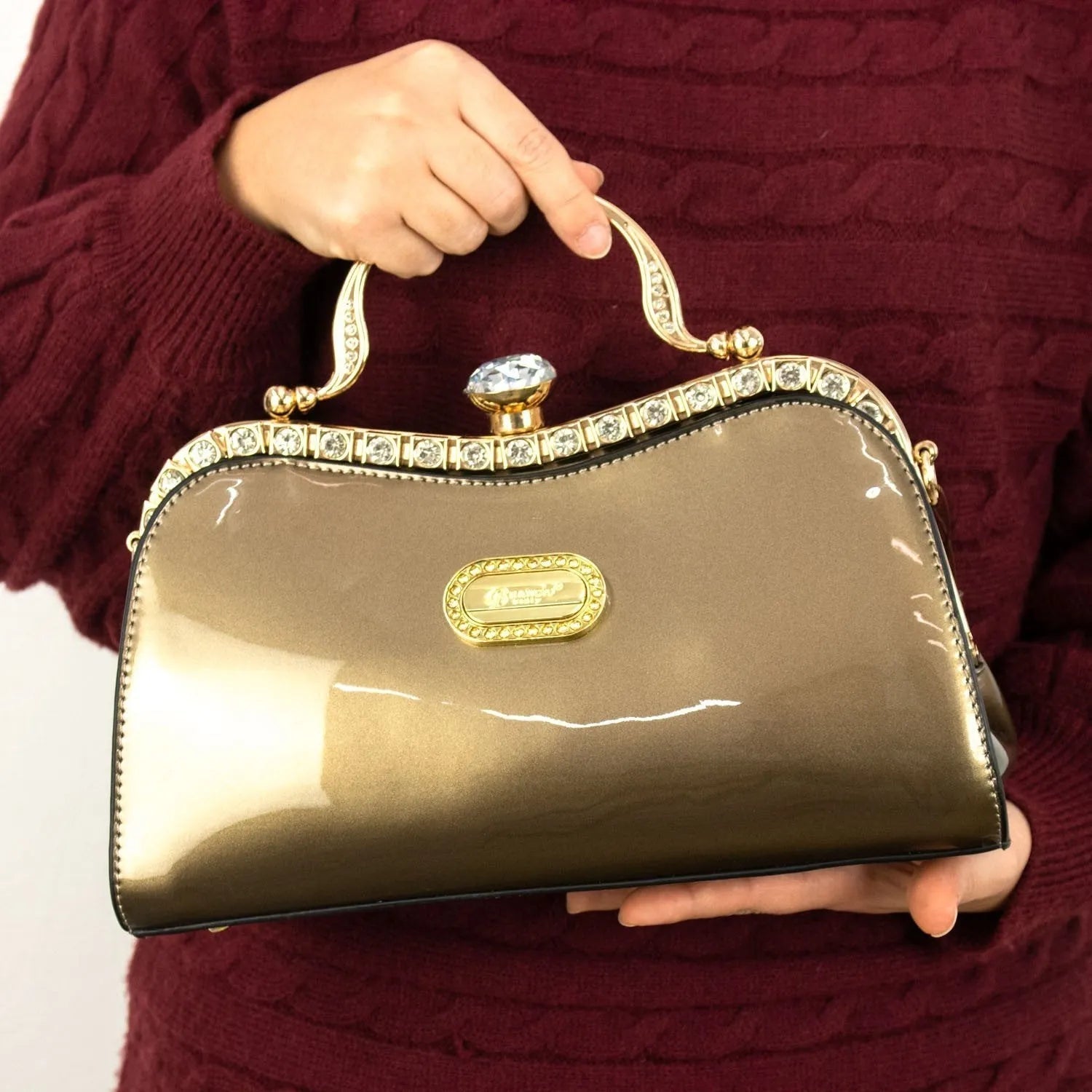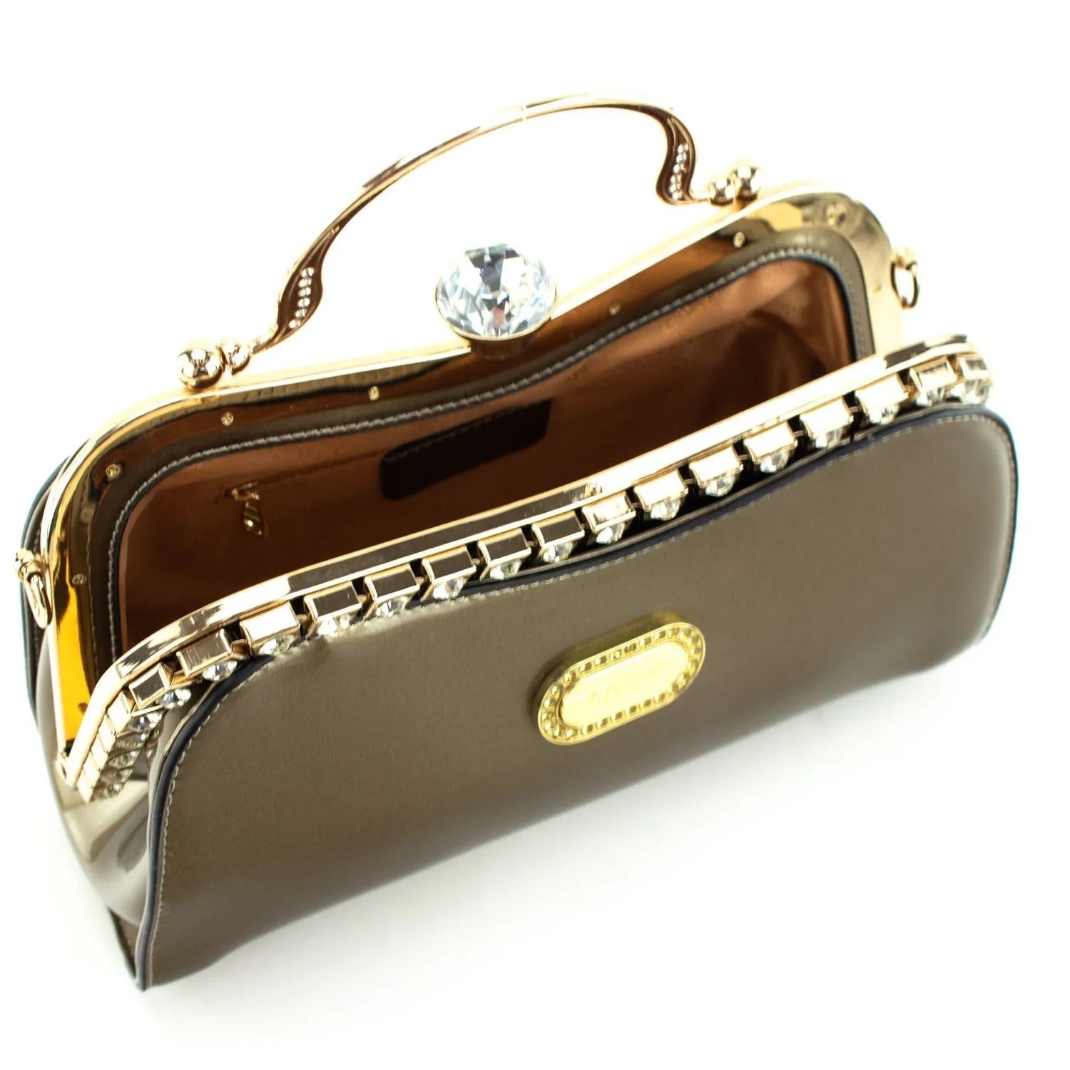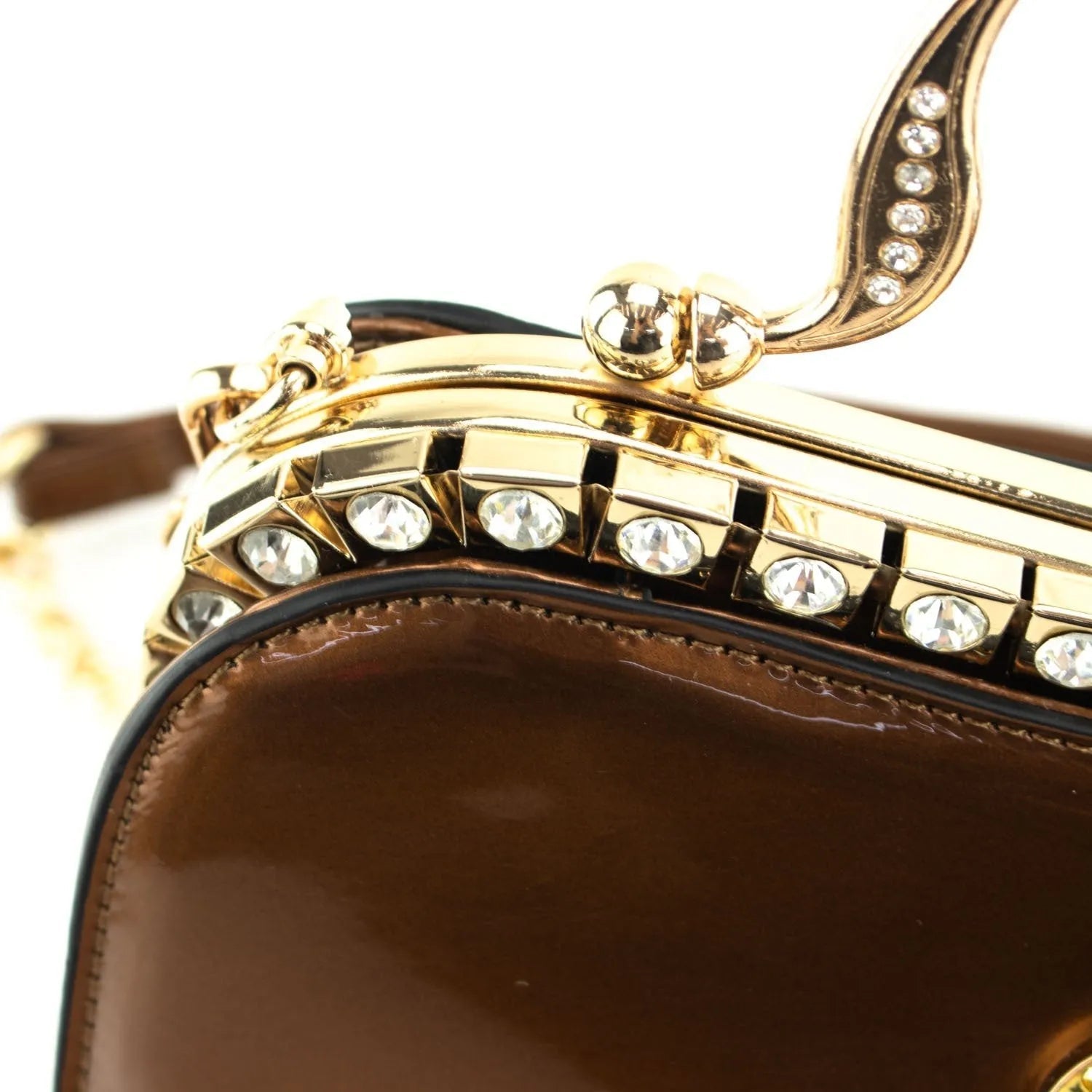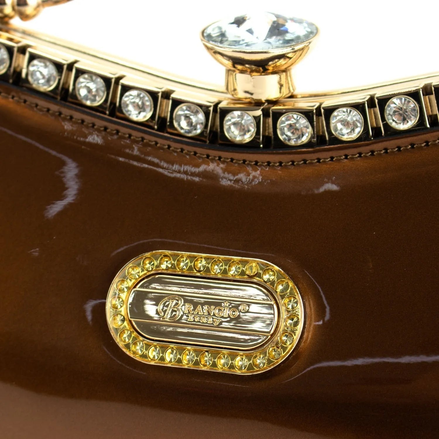 Un bolso super original estilo clutch que te enamorará anda más tenerlo en tus manos. Un bolso espectacular con asa de mano y cinta de bandolera en cadena metalizada. Con un compartimento interior amplio con cierre de broche espectacular. Acabado con tonos lisos en charol brillante y decorado con brillantes y apliques ¡Te encantará!