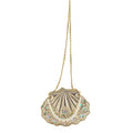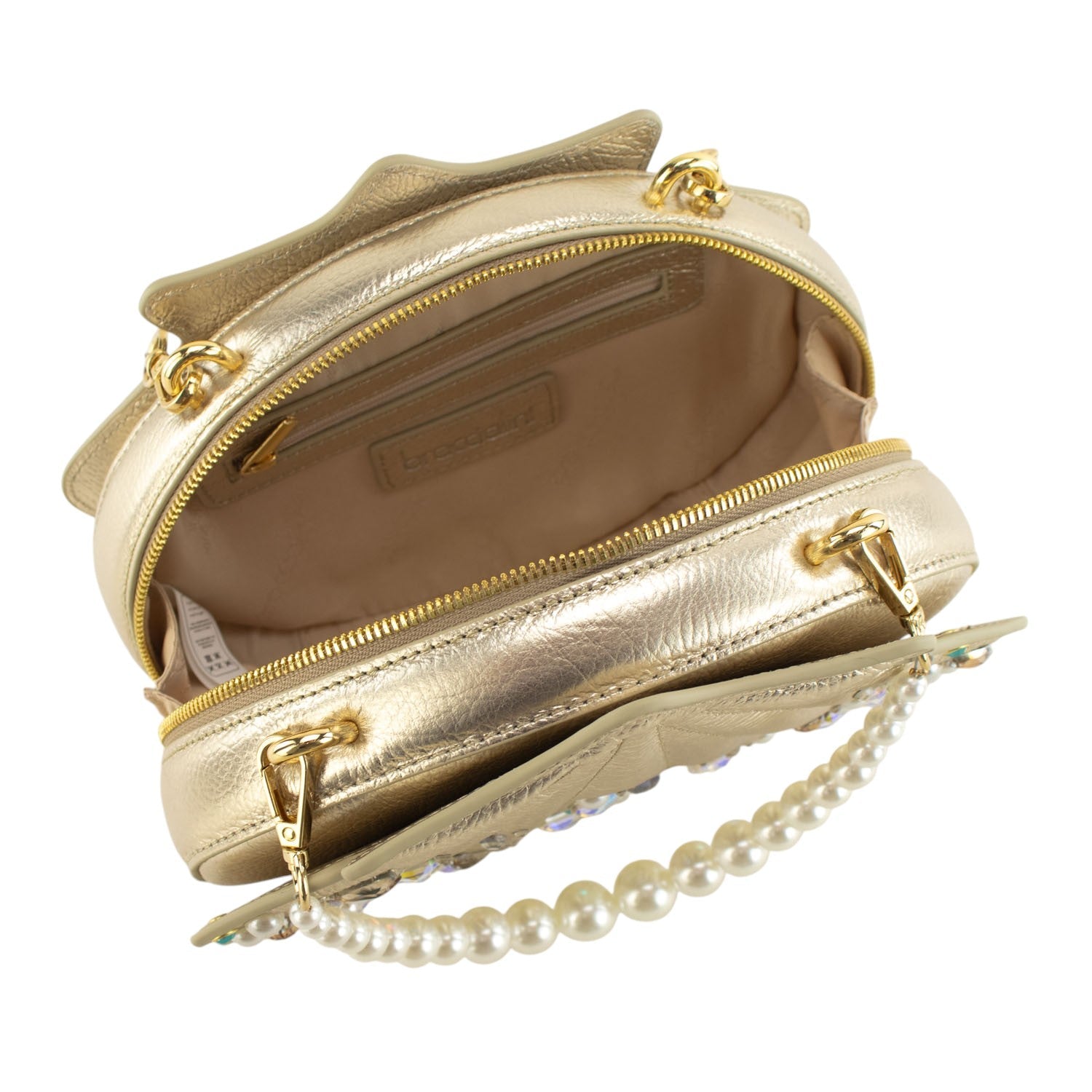 Braccialini sorprende con este espectacular Bolso de mano en forma de concha, con asas con perlas y detalle de pedrería, este modelo en piel 100% será el toque perfecto en cualquier evento que tengas, con cierre de cremallera y cinta en cadena ideal para llevar al hombro