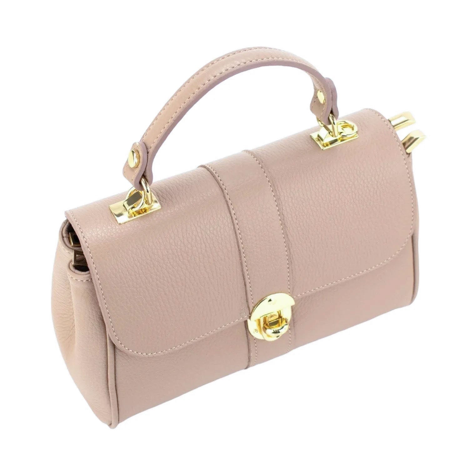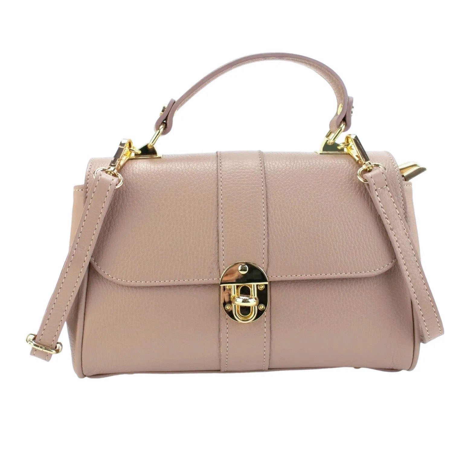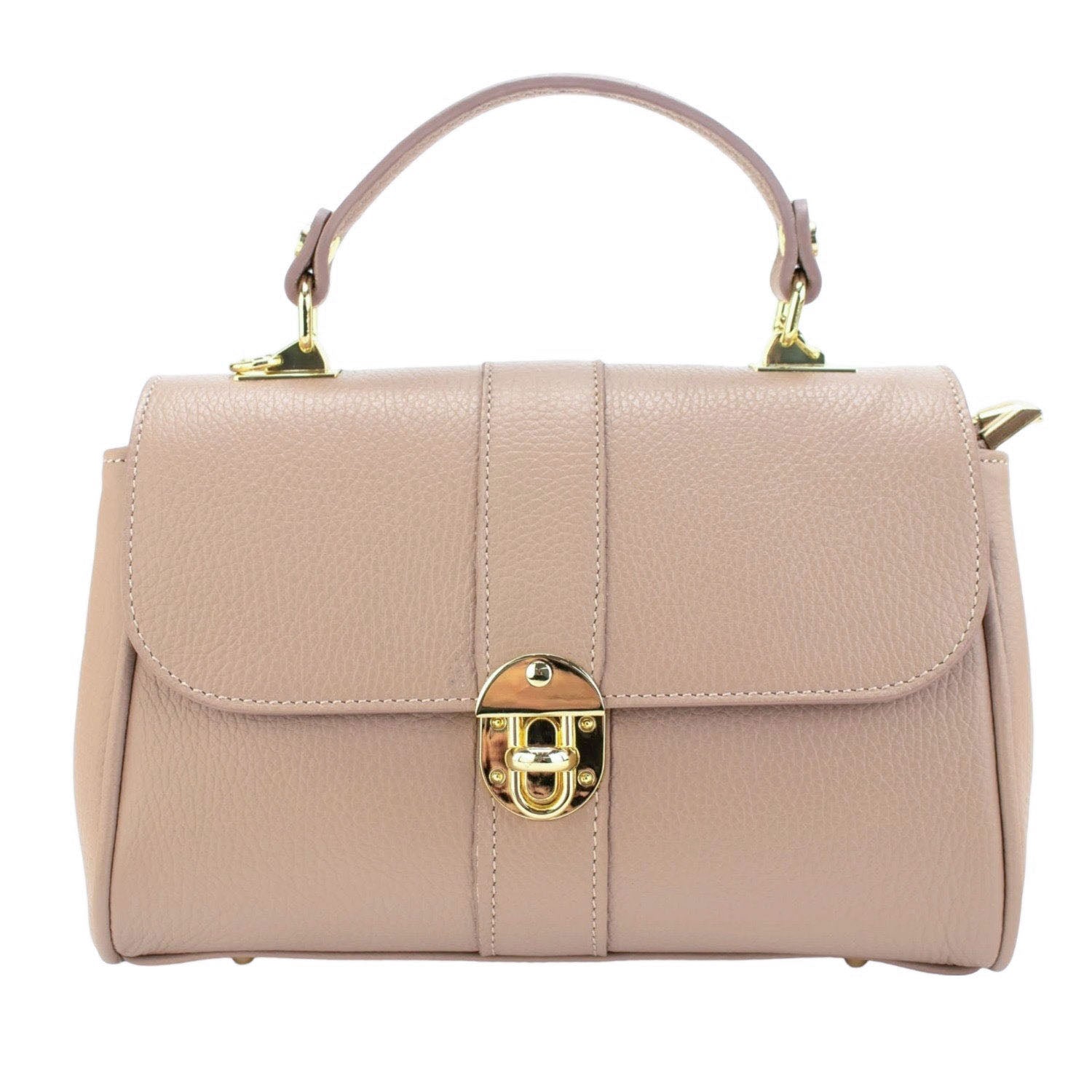 Un bolso muy original para lucir a diario, realizado en Piel 100% genuina vacuno italiana, este bolso está hecho en Italia con una excelente manufactura y calidad, tiene un cierre de solapa broche metalizado en tono dorado muy original, con doble compartimento interior amplio con cierre de cremallera. Dispone de asa mano y cinta de bandolera ajustable.