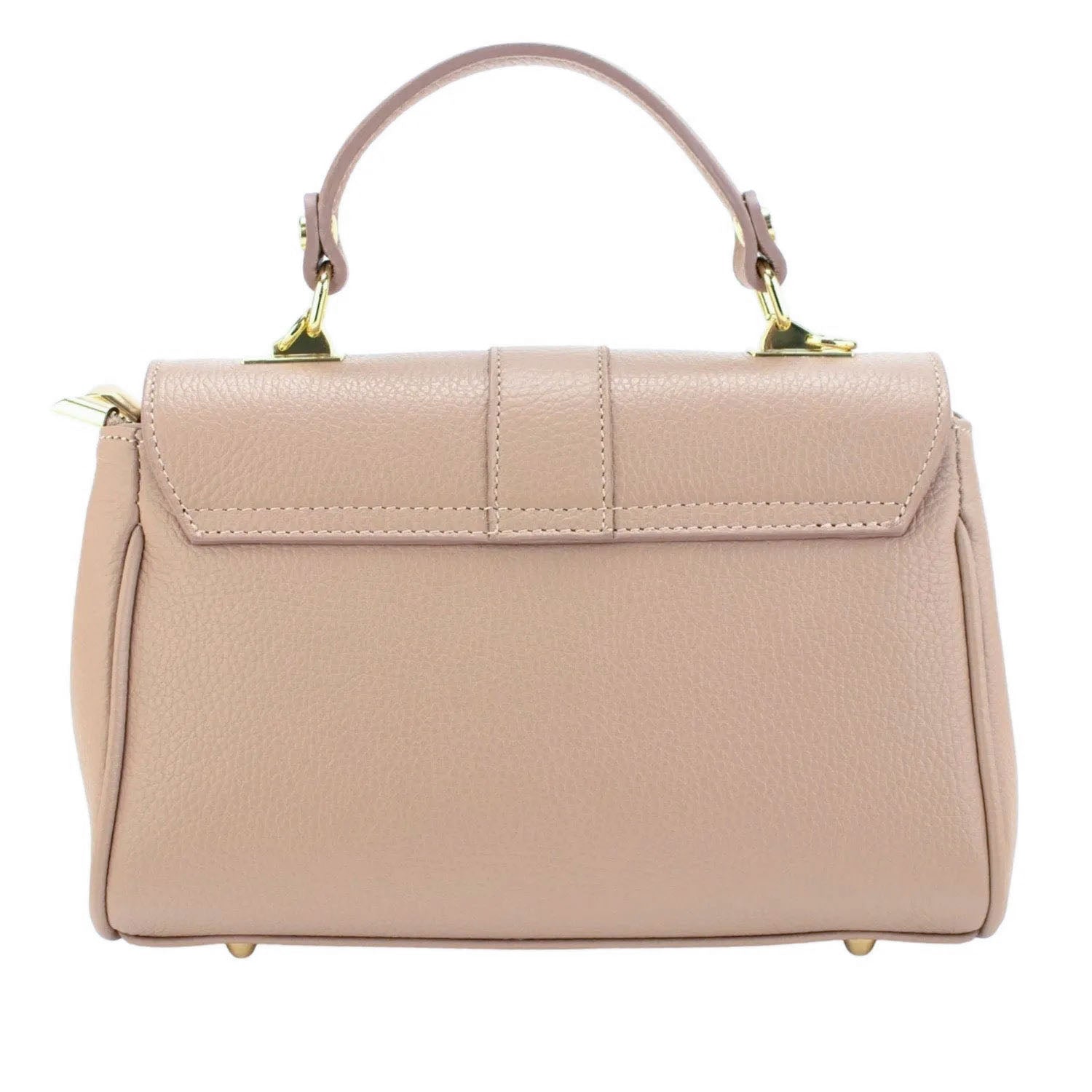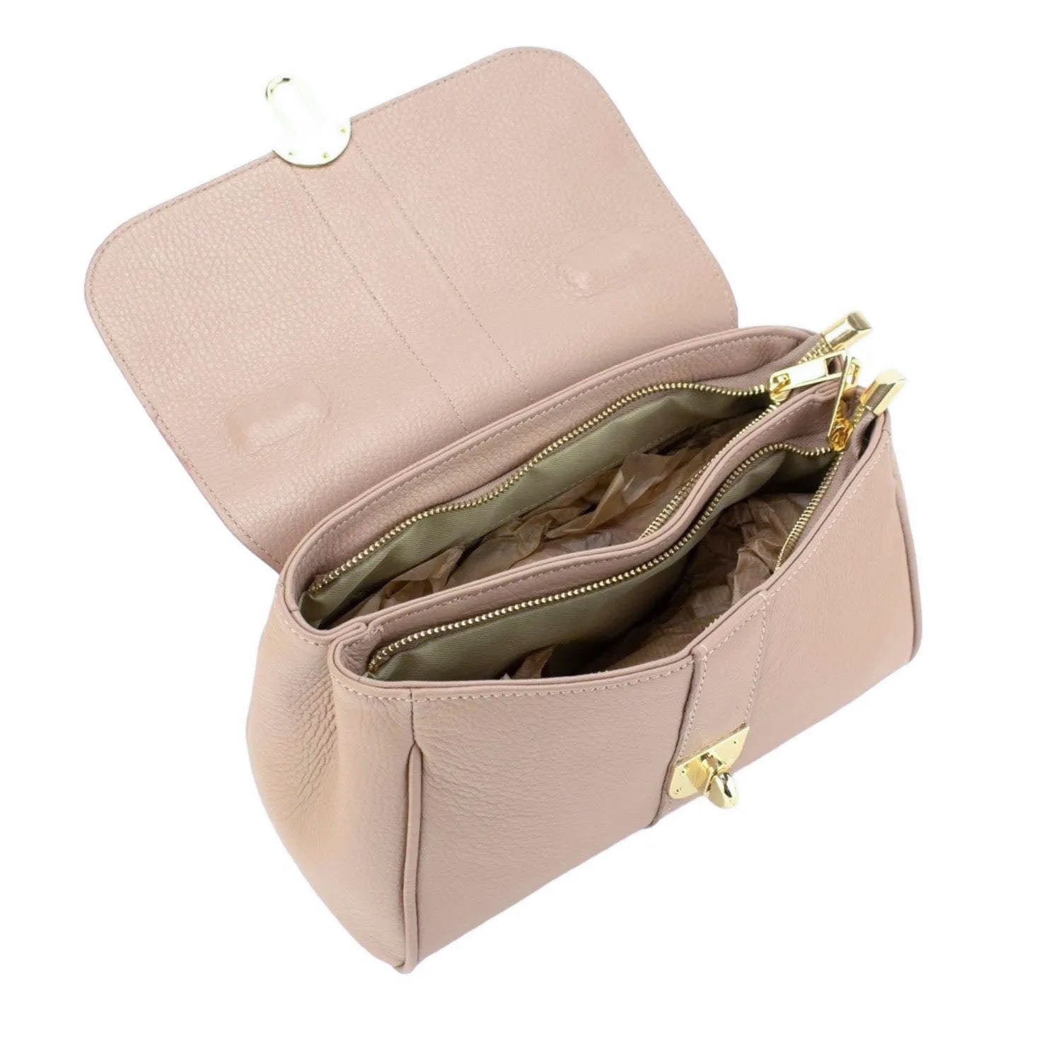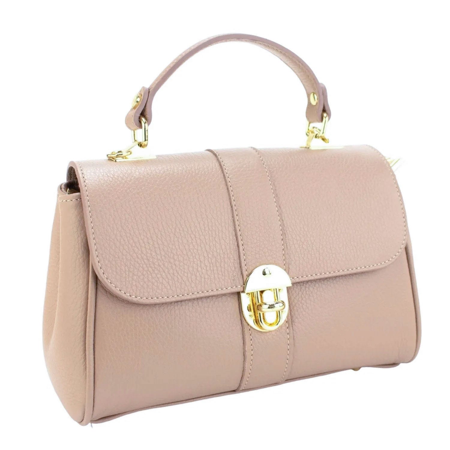Un bolso muy original para lucir a diario, realizado en Piel 100% genuina vacuno italiana, este bolso está hecho en Italia con una excelente manufactura y calidad, tiene un cierre de solapa broche metalizado en tono dorado muy original, con doble compartimento interior amplio con cierre de cremallera. Dispone de asa mano y cinta de bandolera ajustable.