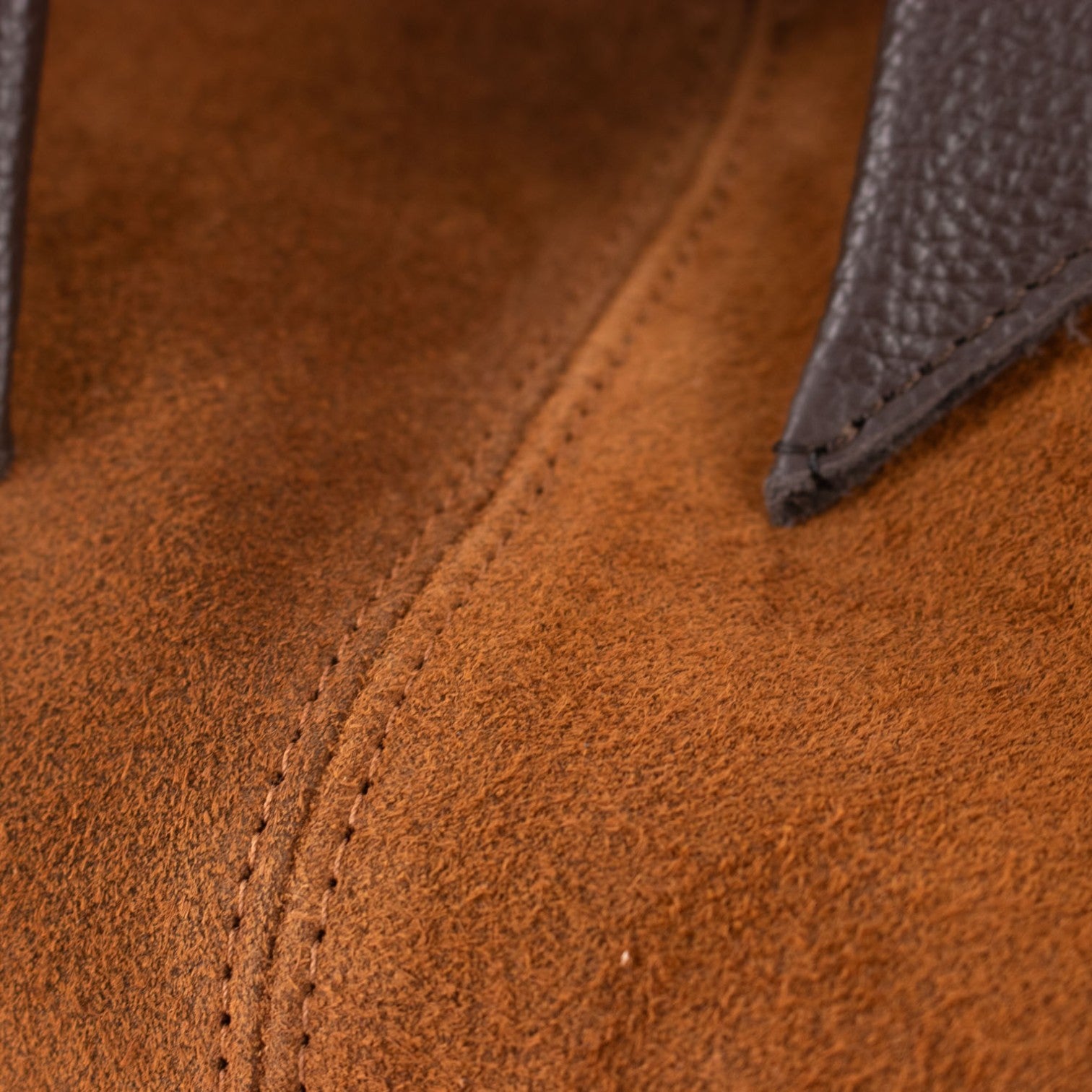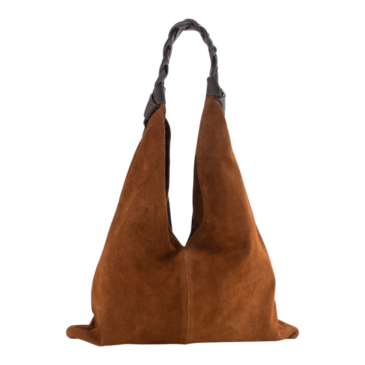 Está confeccionado en suave piel de vacuno ante que destaca por su textura aterciopelada y su acabado de alta calidad. Su característica asa trenzada en piel añade un toque artesanal y distintivo, permitiendo llevarlo cómodamente al hombro. El cierre con imán facilita el acceso al interior manteniendo tus pertenencias seguras.