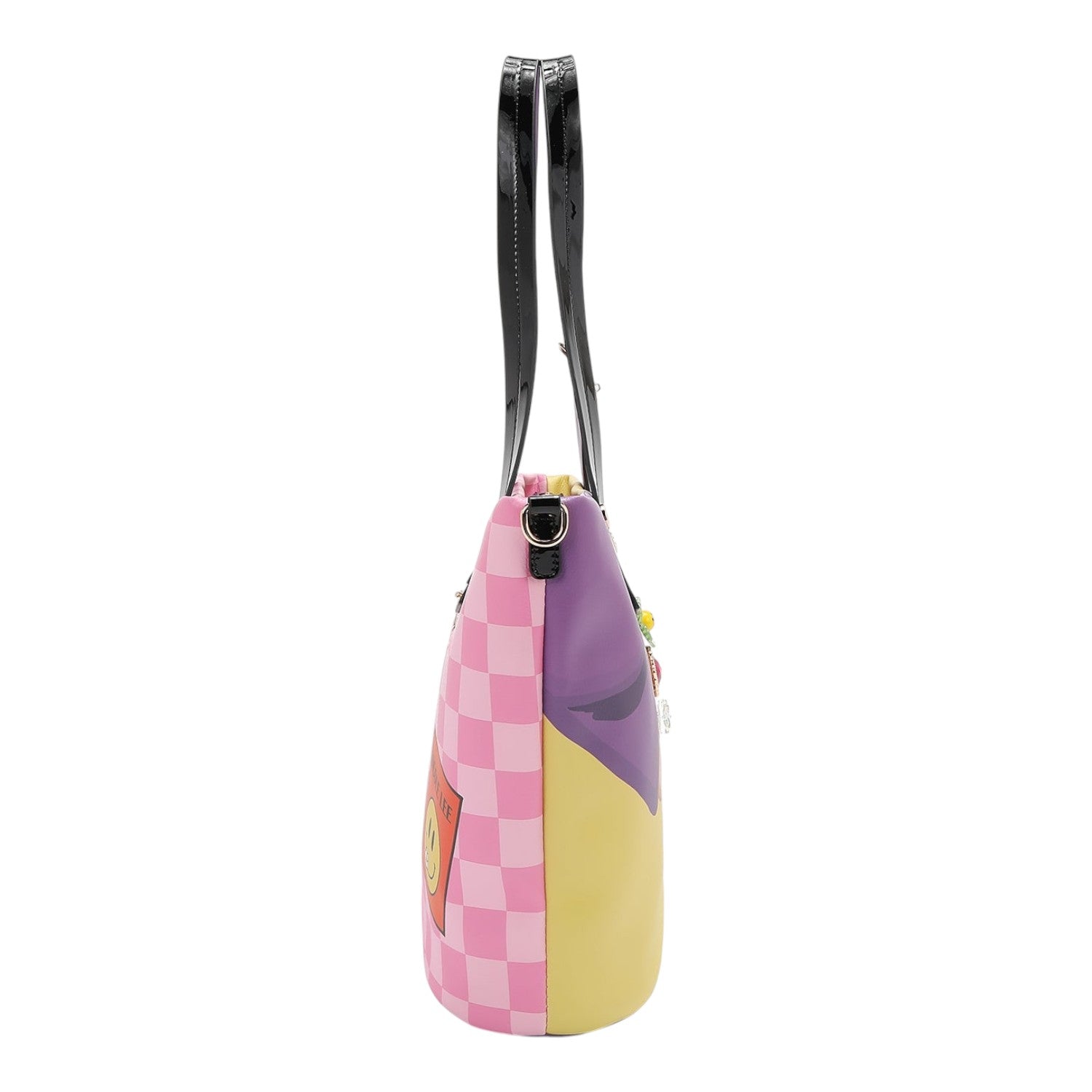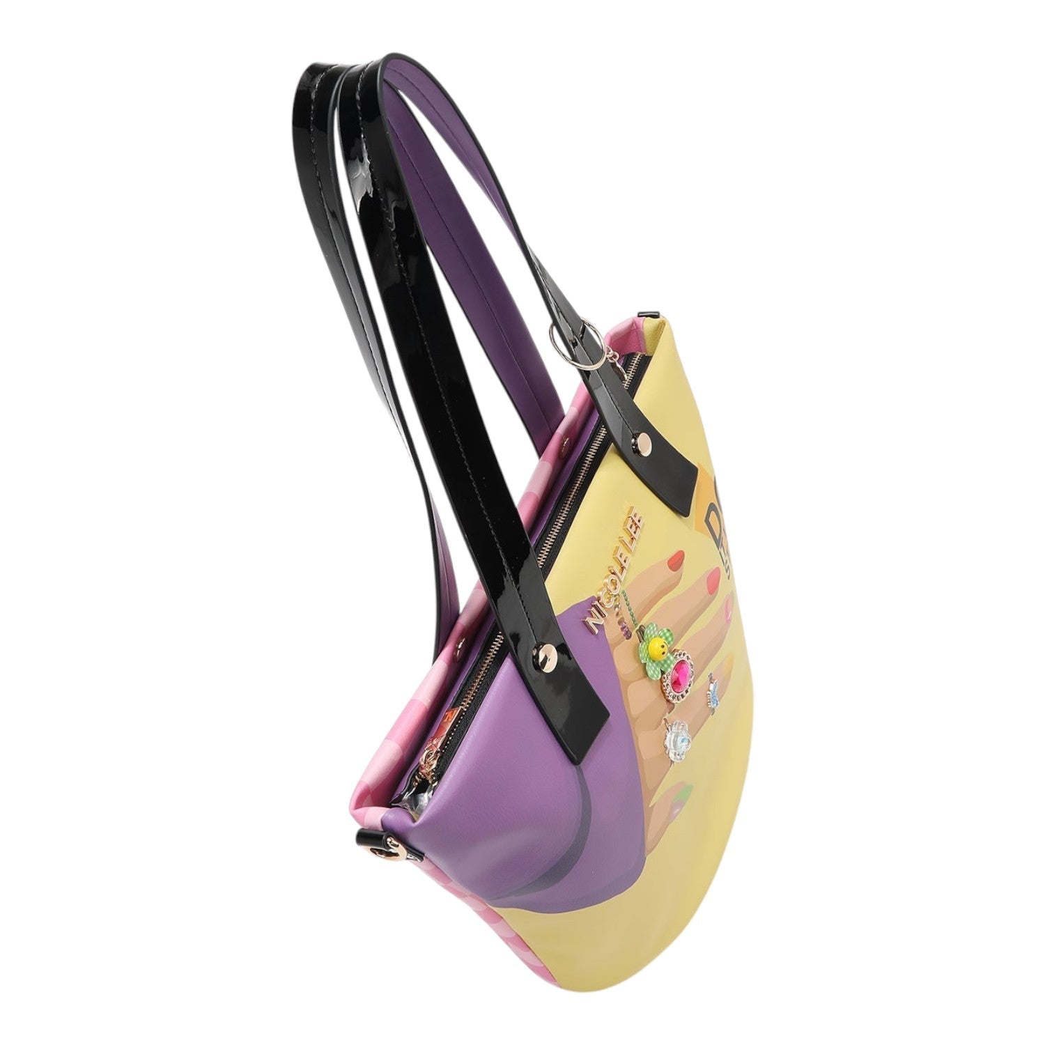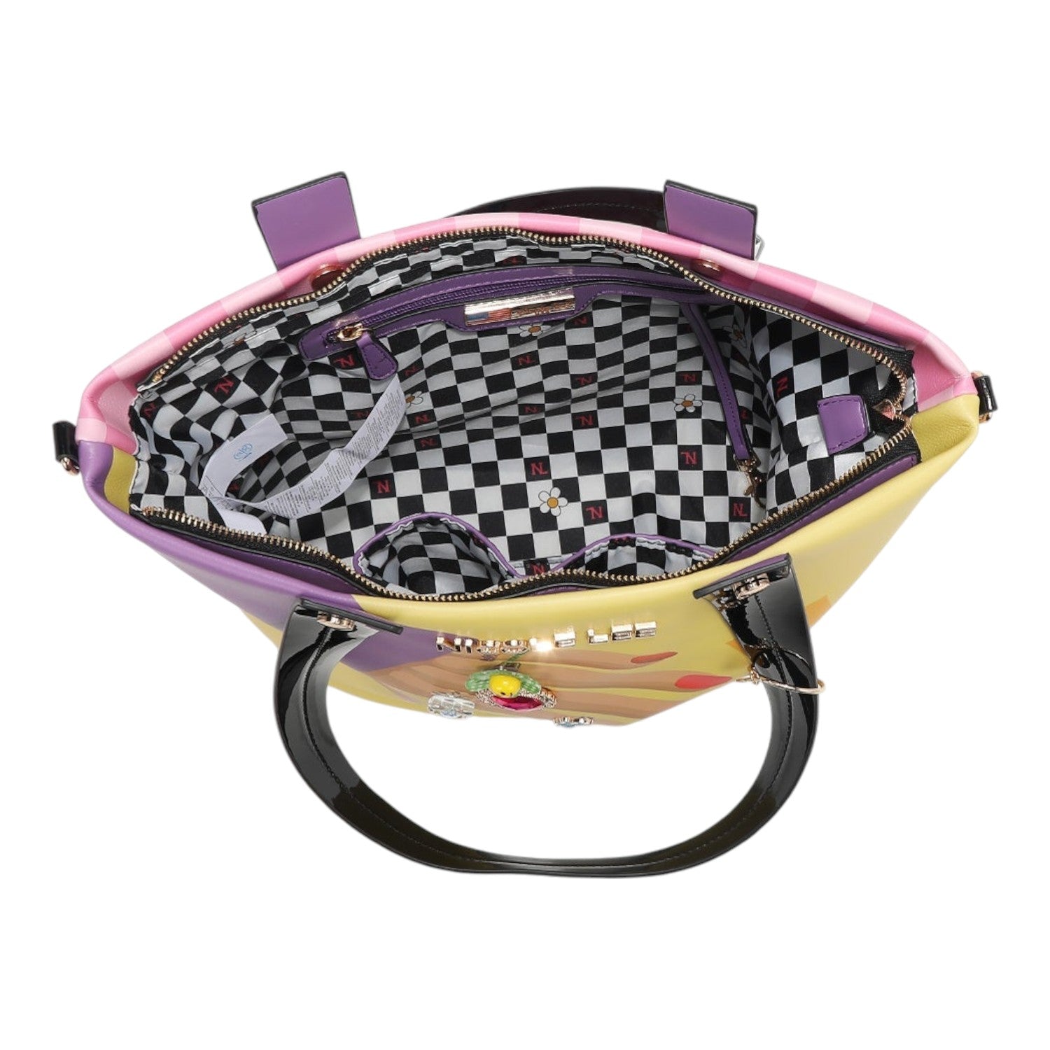 Un bolso super completo perfecto para llevar a diario con doble asa de mano y cinta de bandolera adicional ajustable. Dispone de un compartimento interior muy amplio con cierre de cremallera y múltiples bolsillos para organizar. Acabado colorido con los estampado muy original de Nicole Lee y herrajes en tonos dorados. ¡Te enamorará!