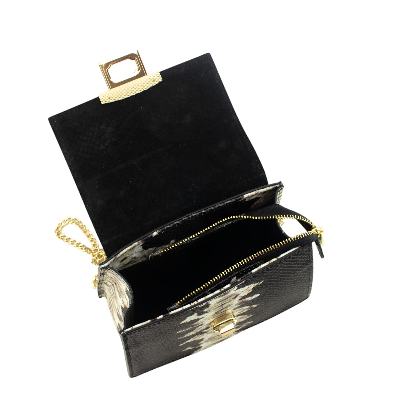 Un bolso muy original para lucir a diario, realizado en Piel 100% genuina vacuno italiana, este bolso está hecho en Italia con una excelente manufactura y calidad, tiene un cierre broche metalizado en tono dorado muy original, con cierre de solapa y cremallera interior, con una preciosa asa de mano y cinta de cadena en tono dorado.